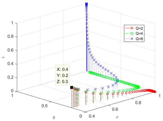 Setting Q to 2, 4, and 8, respectively, the evolutionary results are shown in Figure 8. From Figure 8, it can be seen that the government department eventually evolved into a positive supervision strategy in all three cases, which indicates that the change in the financial benefits provided by the government has little effect on the government’s willingness to regulate. SRW producers evolve to adopt non-ecological behaviour when the financial benefits provided by the government are 2. In contrast, SRW producers evolve to adopt ecological behaviour when the financial benefits provided by the government are 4 and 8, which indicates that incentive measures have a positive effect on the adoption of ecological behaviour by SRW producers. On the other hand, comparing Q = 4 and Q = 8, we can also observe that the incentives also positively influence the eligible disposal behaviour of SRW recyclers. In the case of Q = 8, the government provides more financial support, and the unilateral implementation of SRW recycling is less risky. Hence, producers and recyclers are willing to adopt ecological behaviour, and qualified disposal behaviour.