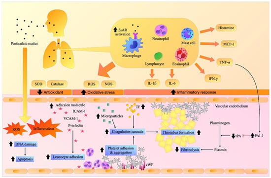 PM could also induce cAMP secretion and activate further downstream pathways, resulting in the enhancement of PM-mediated IL-6 release in murine alveolar macrophages (MH-S) and human alveolar macrophages []. In addition, administration of albuterol, a β2AR agonist, enhanced PM-induced IL-6 release in human alveolar macrophages and MH-S cell lines, while the alveolar macrophages from Adrb2−/− mice incubated with albuterol showed a decreased PM-mediated IL-6 response []. These findings suggest that PM-mediated IL-6 release was dependent on the activation of β2AR, encoded by the Adrb2 gene. Moreover, PM was also shown to activate the microparticles and cause intracellular calcium release, and to enhance tissue factor function in HUVECs and peripheral blood mononuclear cells (PBMCs) []. The activation of tissue factors would further trigger blood coagulation via the TF-FVII complex, leading to thrombus formation.