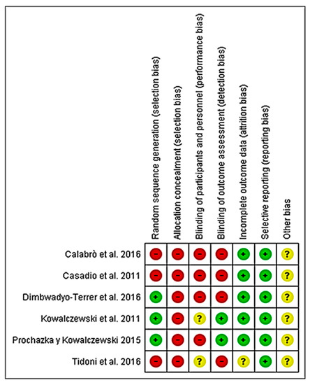 The Cochrane Collaboration’s tool [36] was used to analyze the risk of bias, developed by the Review Manager 5.3 software (Copenhagen, Denmark). This tool includes an evaluation of different items in terms of risk of bias. The studies are categorized as: “unclear risk”, “low risk”, and “high risk”. Two reviewers conducted the risk of bias assessment. In cases of doubt, a third assessor took part in the final decision.