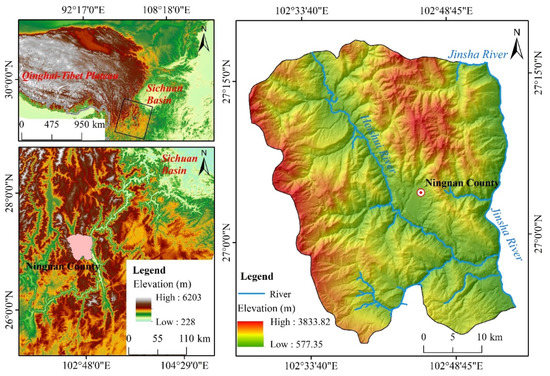 Location and elevation maps of the study area. Ningnan County is located on the southwestern edge of the Sichuan Basin in China, and its northwest region is the Qinghai–Tibet Plateau.