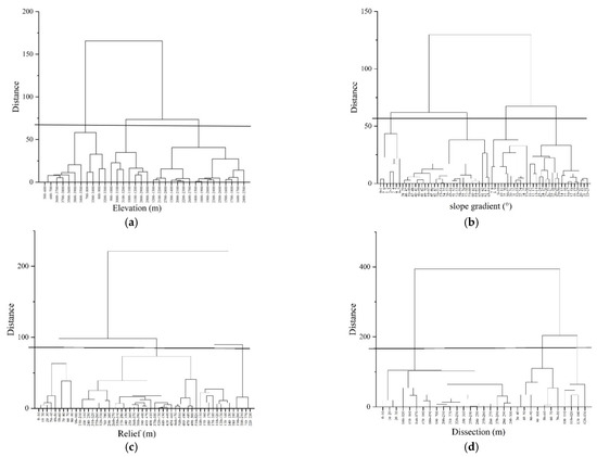 Tree diagram of hierarchical clustering in topographic factors. The horizontal line in the figure is the distance value for classification. The closer the distance, the more similar the gully erosion forms in the topographic range classification. (a) Tree diagram of hierarchical clustering in elevation; (b) Tree diagram of hierarchical clustering in slope gradient; (c) Tree diagram of hierarchical clustering in relief; (d) Tree diagram of hierarchical clustering in dissection.