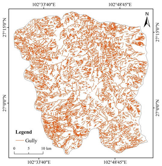 The distribution characteristics of gullies in the study area by visual interpretation of remote sensing images.