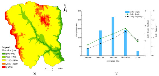 (a) Distribution of reclassified elevation ranges; (b) Characteristics of gully system parameters (gully length, density, and frequency) under different elevation ranges.