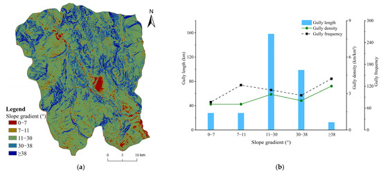 (a) Distribution of reclassified slope gradient ranges; (b) Characteristics of gully system parameters (gully length, density, and frequency) under different slope gradient ranges.