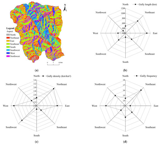 Figure 6 shows the coupling relationship between the development characteristics of gullies and slope aspect. The gullies have different distribution characteristics on different aspects (Figure 6). The spatial variation trend of gully length on the western, southwestern and southern slopes was relatively gentle, whereas the gullies had a larger distribution on the northeastern, eastern and southeastern slopes. Gullies were strongly developed on the western, southwestern, eastern and northeastern slopes. The gully density was highest on the northeastern slopes, reaching 3.30 km/km². The gully density was smaller on the northwestern, northern and southeastern slopes. The southern slopes had the lowest gully density. Based on the statistics, the total gully lengths of sunny, semi-sunny, semi-shady and shady slopes were 945.70, 1045.02, 1386.59 and 1374.48 km, respectively, and the average gully densities were 2.68, 2.69, 2.93 and 2.90 km/km², respectively. The distribution characteristics of gully erosion intensity were shady slope > sunny slope and semi-shady slope > semi-sunny slope. The density of gullies in the shady slope area was 2.92 km/km² and the gully density in the sunny slope area was 2.69 km/km². These statistical results show that the degree of gully erosion on shady slopes was greater than that on sunny slopes and that the gully erosion intensity increased on shady slopes.