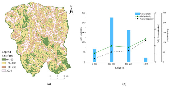 (a) Distribution of reclassified relief ranges; (b) Characteristics of gully system parameters (gully length, density, and frequency) under different relief ranges.