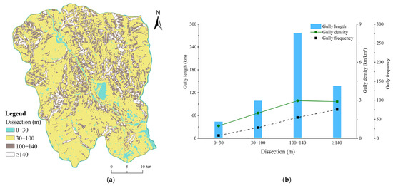 (a) Distribution of reclassified dissection ranges; (b) Characteristics of gully system parameters (gully length, density, and frequency) under different dissection ranges.