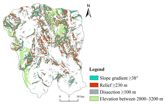The intensity of gully erosion first increased and then decreased with increasing elevation in this study, which is similar to the previously research results of typical rolling hill Mollisol region of Northeast China, where gully erosion decreases near the top of the slope [46]. Study found that gullies were strongly developed where the slope gradient was larger because the gravity effect was greater on large slope gradients, resulting in the decline of surface soil, and rainfall runoff also caused strong erosion under the effect of gravity. Rapid soil erosion occurred on steep slopes in areas with the greatest gully erosion or in sparsely vegetated wastelands. It is found that the gully erosion areas analyzed by the three topographic parameters of slope gradient, relief and dissection are highly coincident (Figure 9), and they belong to the middle mountain area in terms of landform. Therefore, the landform composed of multiple topographic factors is very important in the development of gully erosion, and follow-up research can focus on the correlation between landform and gully erosion development.