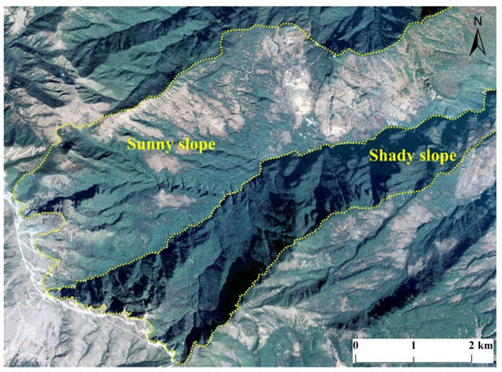 Topographic and vegetation characteristics of typical shady and sunny slopes in the study area, there is a gully between the sunny slope and the shady slope.