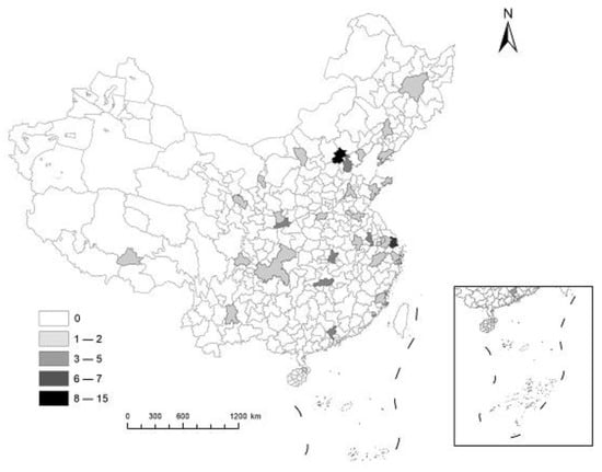 It is plausible for us to define the applicants who apply for 76 double first-class universities of UNGEE as the elites. According to the requirements of the China Graduate Admission Information Network, the applicants for UNGEE must be the people who are about to obtain or have already obtained bachelor’s degrees, or have graduated from vocational college for over 2 years (see https://yz.chsi.com.cn/kyzx/jybzc/202109/20210903/2105941509.html (accessed on 3 September 2021)). However, for the applicants who graduated from vocational college, the aimed universities that they choose require them to have academic achievements in the journals of the Chinese Science Citation Database or Chinese Social Sciences Citation Index in the past 3 years, additionally. Therefore, most of the applicants who apply for UNGEE successfully are those who are about to or have obtained bachelor’s degrees. According to the data that was released by the National Bureau of Statistics of China, until 2019, the number of undergraduates in China accounted for only about 3.8% of the total population (see http://www.stats.gov.cn/ (accessed on 2 December 2020)). No matter the education degree or the population proportion, applicants who apply for UNGEE can be treated as elites in China. Under this premise, based on 137 double first-class universities that are listed in China’s fourth round of subject evaluation (see http://www.cdgdc.edu.cn/xwyyjsjyxx/xkpgjg/ (accessed on 28 December 2017)), and further considering whether the schools’ official websites have published the application data of past years for UNGEE, 76 universities are finally determined as the research sample (The specific list of 76 universities is shown in Table A1 in the Appendix A. Some universities have different campuses in different cities; in this paper, the campuses of the same universities in different cities are regarded as different universities). We manually crawl the data that include the quantity of applicants for 2010–2021, the number of students to be enrolled in the admission brochure for 2010–2021, and the enrollment ratio for 2009–2020. The amount of universities that we choose holds for 55.5% of all double first-class universities, and the geographical distributions of them cover 34 prefecture-level cities of 25 provinces in China. Figure 1 plots the specific regional distribution and number of double first-class university for every city. From the layout, the universities are locating in Shihezi of Xinjiang in the west, Ningbo of Zhejiang in the east, Harbin of Heilongjiang in the north, and Haikou of Hainan in the south, which have a generally representative in area. Owing to the fact that the data of some universities are missing in some years, the data that we use are an unbalanced panel data and the total amount is 585. Due to the need to examine the differences between applicants of different disciplines, and according to the “Catalogue of Disciplines and Majors for Granting Doctoral” and “Master’s Degrees and Cultivating Postgraduates” that are issued by the Ministry of Education of the People’s Republic of China (MOE of PRC) (see http://www.moe.gov.cn/srcsite/A08/moe_1034/s3882/201209/t20120918_143152.html (accessed on 14 September 2012)), we further divide the applicants into social science and natural science and then re-count the quantity of the different discipline applicants (social science includes: philosophy, economics, law, education, literature, history, military science, and management; natural science includes: science, engineering, agriculture, and medicine).