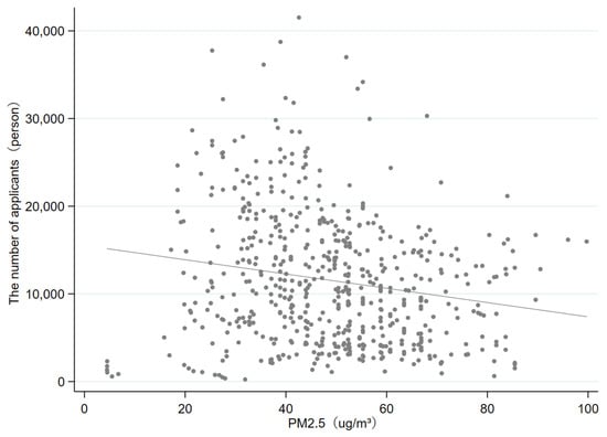Before reporting the benchmark results, we preliminarily examine the relevance between PM2.5 concentration and the number of applicants. From the fitting diagram (Figure 2), there is a strong negative correlation between PM2.5 concentration and the quantity of applicants. In addition, the regression coefficient is −236.6853, and p-value is 0.00, which is significant at 1% level. It illustrates that the more severe the city air pollution, the fewer the number of applicants. Next, we will use a panel fixed-effect model to empirically test the specific impacts of air pollution on the applicants’ university-city choices.