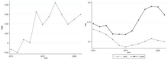 To verify the above conclusion of different regions, we analyze the application data and PM2.5 concentration data and then draw the trend graphs (Figure 4). The left side of Figure 4 shows the trend of northern air pollution deterioration ratio (deterioration ratio = (average northern PM2.5 concentration − average national PM2.5 concentration)/average national PM2.5 concentration), and the right side of Figure 4 is the trend of the proportion that the applicants of northern and southern universities account for the whole country from 2010 to 2021. From the left side, we can find that the ratio has gradually increased during the period, manifesting that compared with the whole country, northern air pollution is aggravating. From the right, the proportion of the number of applicants to northern universities is gradually decreasing, while the ratio of southern universities is gradually increasing, summarizing that with the deterioration of northern air quality, the university-city choosing intentions of applicants are shifting from north to south. The factual analysis confirms our above conclusion reasonably.