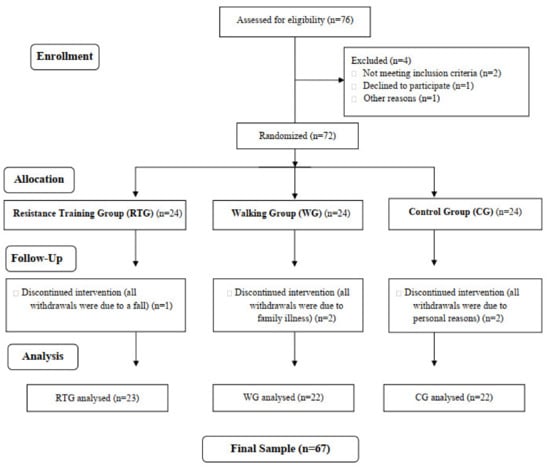 Due to a possible discontinuity in the intervention, a quantity approximately 10% larger than the estimated value was selected. Thus, after the sampling procedure, 76 individuals were selected. Then, the inclusion and exclusion criteria were applied after recruiting all 76 women. The older women were randomly divided by the Excel random function into three study groups, with 24 participants in each group. During the follow-up, five older women dropped out of the study due to a fall (1), family illness (2), and personal reasons (2). Thus, the final sample of this study consisted of 67 participants, divided into the resistance training group (RTG; n = 23), the walking group (WG; n = 22), and a control group (CG; n= 22). Figure 1 shows a flowchart diagram of randomization of the participants.