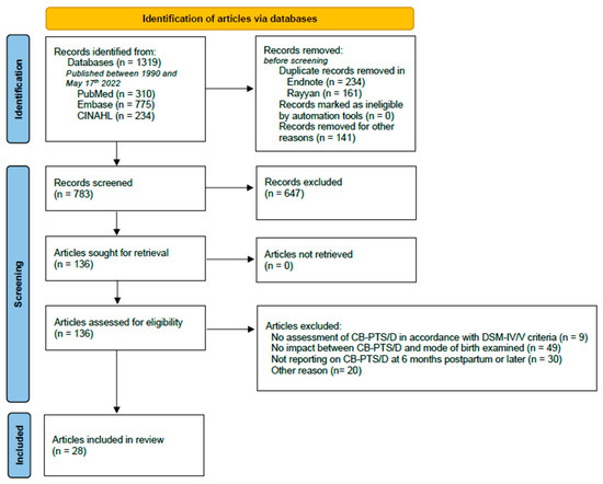 Both quantitative and qualitative studies were eligible for this review. We included English written published articles and did not include results of unpublished data or materials. Studies that recruited women during pregnancy or after childbirth were eligible. We excluded studies reporting results exclusively for women younger than 18 and/or for those with less favorable perinatal outcomes (such as postpartum hemorrhage and premature or low-birth weight newborns), as those conditions are associated with CB-PTS/D [40,41].