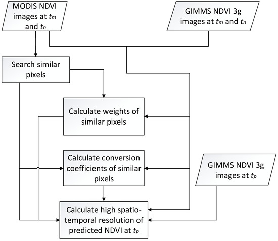 Schematic explanation of the enhanced spatial and temporal adaptive reflectance fusion model (ESTARFM) for fusing GIMMS NDVI3g and MODIS NDVI.