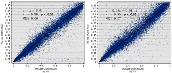 We summarized and plotted the values of pixels in the fused GIMMS NDVI3g image and the real MODIS NDVI image in 2000, 2005, 2010, and 2015, as shown in Figure 2. The fused GIMMS NDVI3g data and the real MODIS NDVI data were in good agreement. The scattered points of the pixels were evenly distributed along the trend line of , indicating a decent prediction effect.