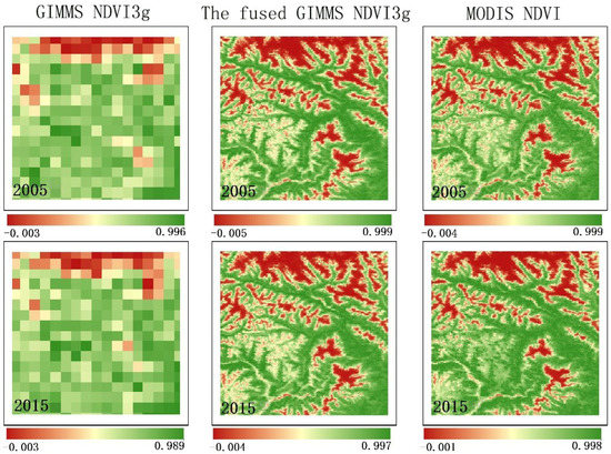 By comparing the details of GIMMS NDVI3g data, fused GIMMS NDVI3g data, and real MODIS NDVI data in 2000, 2005, 2010, and 2015 (Figure 3), higher pixel resolutions were observed with the fused GIMMS NDVI3g data and real MODIS NDVI data, where the texture of the ground features was clear and the details of some characteristic areas can be identified. In addition, the detailed features of the regional vegetation coverage can be well reproduced.