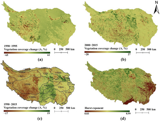 In 2000, the State Council issued the “Several Opinions on Doing a Good Job in Returning Cultivated Land to Forest and Grassland” [45]. Returning farmland to forest and grassland policy was implemented nationwide in China, which generally promoted vegetation growth. In order to explore the change in vegetation on the Qinghai–Tibet Plateau since the promulgation of this policy, the profile of vegetation coverage and Hurst index of the Qinghai–Tibet Plateau around 2000 and 1990–2015 were calculated in this study, as shown in Figure 4. From 1990 to 1995, 37.46% of the area was subject to vegetation degradation. The land with values less than −0.5%, between −0.5% and 0%, and between 0% and 0.5% accounted for 9.93%, 27.53%, and 54.42% of the total area, respectively, while the land with values over 0.5% accounted for 8.12% of the total area. From 2000 to 2015, 52.47% of the area suffered from vegetation degradation, with an average growth trend () of 0.02%. The land with values less than −5%, between −5% and 0%, and between 0% and 5% accounted for 0.23%, 52.24%, and 47.37% of the total area, respectively, while the land with values over 5% accounted for 0.15% of the total area. From 1990 to 2015, the area with vegetation degradation increased to 73.49% with an average growth trend () of −0.041%. The land with values less than −5%, between −5% and 0%, between 0% and 5%, and over 5% accounted for 0.10%, 73.39%, 26.42%, and 0.08% of the total area, respectively. According to the distribution of vegetation temporal profile from 1990 to 2015 (Figure 4c), it is clear that the vegetation changes on the Qinghai–Tibet Plateau were spatially heterogeneous and specifically manifest as degradation in the west and rise in the east. Furthermore, the degradation of vegetation was prevalent in the study area. Areas with a Hurst index less than 0.5, over 0.5, and equal to 0.5 accounted for 9.16%, 80.59%, and 10.25% of the total area, respectively. The spatial distribution of the Hurst index indicated that the change of vegetation characteristics in most parts of the Qinghai–Tibet Plateau was continuous, whereas the continuity was not evident in the western Sichuan and the northern Yunnan regions. The comprehensive vegetation change trend and Hurst index showed that 22.14% of the Tibetan Plateau continued to improve from 1990 to 2015 (and ).