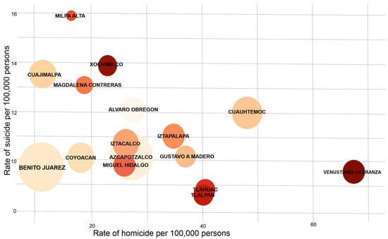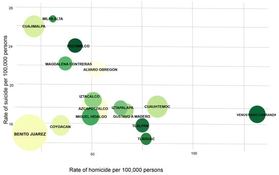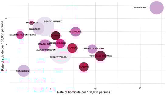 The rate of homicides calculated for Mexico City was 17.11 homicides per 100,000 inhabitants in 2019; this rate also varied among municipalities. The results showed ranges from 16.68 to 67.41 per 100,000 inhabitants. Figure 1 shows the distribution of suicide/homicide in the different municipalities of Mexico City. As an interesting fact, we observed that Milpa Alta Municipality showed the lowest homicide rate and, at the same time, the highest suicide rate. Similarly, Venustiano Carranza Municipality had the lowest suicide rate, but the highest homicide rate.