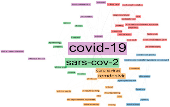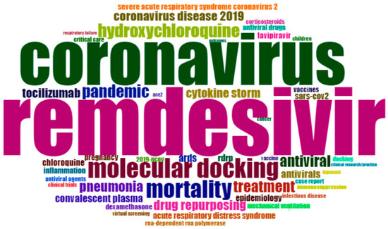 Figure 2 shows the result of the word-cloud analysis made from the authors’ keyword. The figure depicts the most populated areas, such as COVID-19, SARS-CoV-2, remdesivir, coronavirus, molecular docking, mortality, hydroxychloroquine, pandemic, treatment, antiviral, etc. The word cloud is dominated by ‘COVID-19’ (1324), ‘SARS-CoV-2’ (750), ‘remdesivir’ (326), ‘coronavirus’ (250), ‘molecular docking’ (94), ‘mortality’ (86), ‘hydroxychloroquine’ (65), ’pandemic’ (62), ‘treatment’ (57), and ‘antiviral’ (56), which suggests that these terms have the highest frequency in the literature on remdesivir. Another frequent keyword is ‘pneumonia,’ which is strongly associated with coronavirus [54,55]. This is why much research is conducted on the therapeutic efficacy of remdesivir. Many researchers link remdesivir with drug repurposing [56] and rdrp [57]. All the keywords were interrelated and addressed many current issues.