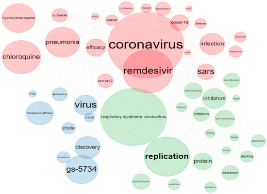 Furthermore, the authors’ keywords and keyword-plus distribution were evaluated to find the most common search topics and their preferences. The analysis of the authors’ keywords provides evidence of research trends from the perspective of researchers and has proved crucial for the development of science [58]. Meanwhile, keywords plus provide additional search terms taken from the article titles quoted by authors in their bibliographies and footnotes [59]. In addition, cluster analysis can be used to explore the themes of articles derived from keywords and keywords-plus of authors; thus, co-occurrence-network analysis was utilized to gain insights about trends n remdesivir research.