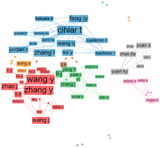 Academic collaboration between authors usually greatly facilitates knowledge and exchange, thereby broadening the field in question. As expected in the remdesivir research field, notable cooperative relationships occurred at multiple levels (Figure 5). To identify the authors who contributed the most, we ranked them by their total number of citations. Based on the data extracted, we found that Wang, Y., and Zhang, Y. ranked first in terms of co-citations. The two authors received the most recognition in this field and made outstanding contributions. The cooperation-network visualization was performed using the biblioshiny interface. In the collaboration network among authors, institutions, or countries, the Louvain method was used as a clustering algorithm; the number of nodes used was 50, and the minimum edges used was 2 to avoid isolated and one-time collaborations; meanwhile, the isolated nodes were removed. The author-collaboration map reflects the scientific-research cooperation between the authors. The rectangle/node signifies the authors; the size of the circle/node signifies the number of articles. The lines denote the authors’ collaboration strengths, and each color represents a cluster. Notably, the thickness of the connections between the nodes displays the collaboration frequency.