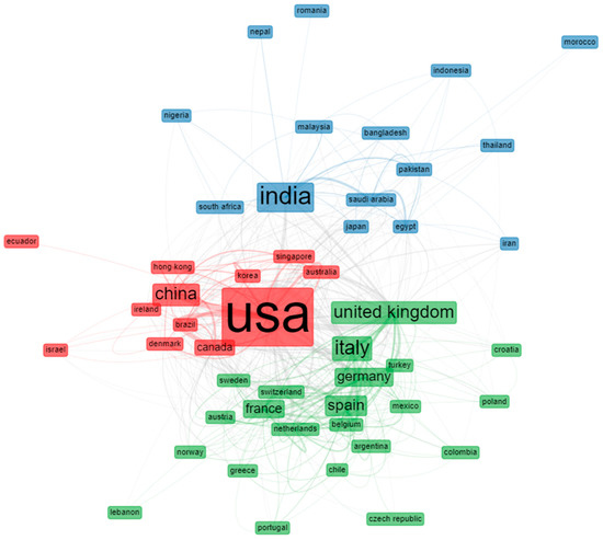 The most cited countries, with their total citations and average article citations, are shown in Table 5. Interestingly, the United States, China, France, and India were the four countries with the highest number of citations, with average article citations of 39.82, 50.92, 50.78, and 14.91, respectively. In addition, assessing the state of collaboration by examining inter-institutional partnerships is very informative. The country-collaboration network of remdesivir-related articles is shown in Figure 6. The network reveals the level of idea exchange between the countries and the dominant countries in this field. The four different colors on the map imply the broadening of research trends. Notably, the significant nodes epitomize the leading countries, while the connection between the nodes signifies the institutional relationships. Moreover, the space between the nodes and the thickness of the connections mean the intensity of collaboration between the countries.