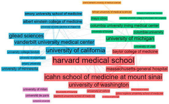 Meanwhile, five clusters are detailed in the institution-collaboration pattern from the 50 most productive institutions. The two largest groups comprise institutions in the USA. Icahn School of Medicine at Mount Sinai, Vanderbilt University, University of Washington, University of Michigan, Harvard Medical School, and the University of California were the central sub-groups, respectively. The Gilead Science biopharmaceutical company acted as a bridge for increasing the collaboration among these institutions. Thus, the USA institutions and the Gilead Science organization formed a core between the corresponding poles (Figure 7).
