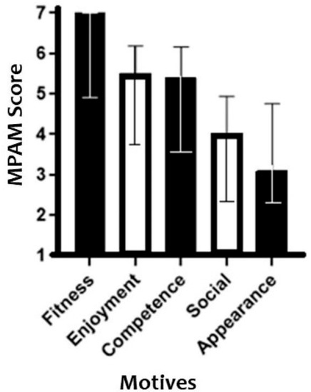 Among the five motives for physical activity that were evaluated by the MPAM-R, fitness achieved the highest score while appearance had the lowest, as shown in Figure 1.