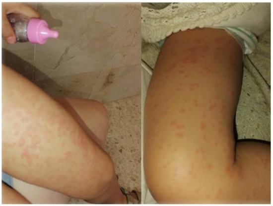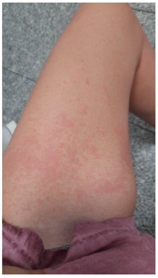 In SARS-CoV-2, as in other viral diseases, a maculopapular rash may appear with or without pruritus, which is the most frequent dermatological manifestation caused by COVID-19. The rashes are mostly present in women and are located on the trunk. It has been reported that, although asymptomatic in 35% of patients, pruritus was the most frequent symptom, occurring in 57% of cases. This type of rash is mainly seen in the active phase of the disease [11]. Treatment is usually symptomatic and will vary depending on the type of maculopapular rash. It is also important to make a differential diagnosis with drug reactions or other types of viruses [12]; see Figure 3.