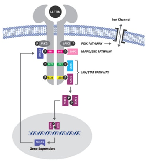 - Ghilardi, N.; Ziegler, S.; Wiestner, A.; Stoffel, R.; Heim, M.H.; Skoda, R.C. Defective STAT signaling by the leptin receptor in diabetic mice. Proc. Natl. Acad. Sci. USA 1996, 93, 6231–6235. [Google Scholar] [CrossRef] [PubMed]