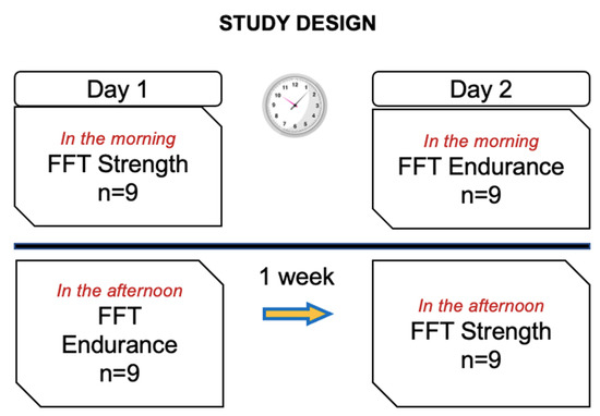 A familiarisation period of exercises was performed the week before the tests, separated by 2 days (Figure 2). In addition, prior to each FFT protocol, the participants performed a warm-up of 5 min of cardiovascular work, 5 min of joint mobility, ballistic stretching and strength exercises.