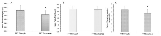 Comparison between FFTs for the variables Heart Rate average (A), Heart Rate final (B), and Rate of Perceived Exertion (C); bpm = beats per minute; * = significant difference (p < 0.05).