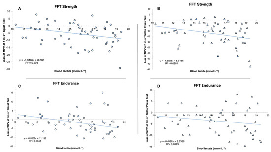 (A) Relationship between loss of MPV at 1 m·s−1 Squat Test and blood lactate in FFTstrength (R2 = 0.091, p = 0.027), (B) relationship between loss of MPV at 1 m·s−1 Military Press Test and blood lactate in FFTstrength (R2 = 0.0981, p = 0.021), (C) relationship between loss of MPV at 1 m·s−1 Squat Test and blood lactate in FFTendurance (R2 = 0.0948, p = 0.024), (D) relationship between loss of MPV at 1 m·s−1 Military Press Test and blood lactate in FFTendurance (R2 = 0.0323, p = 0.194).