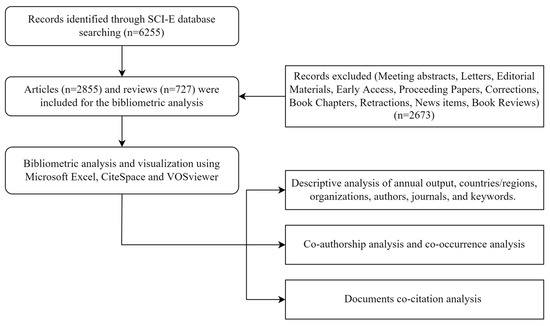 All bibliometric records of the 3582 retrieved literature were downloaded as “full record and cited reference” from SCIE. Microsoft Excel 2019 (Microsoft Corporation, Redmond, WA, USA), CiteSpace version 5.8.R3 (Drexel University, Philadelphia, PA, USA) [24], and VOSviewer version 1.6.18 (Leiden University, Leiden, The Netherlands) [25] were used to standardize, analyze, and visualize the data.