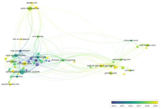 Table S3 presents the top 10 most prolific organizations, and the Catholic University of the Sacred Heart (92, 2.57%), University of Melbourne (73, 2.04%), and Sichuan University (65, 1.81%) are the top three among 3685 organizations. After excluding two nodes without connection to others, the coauthorship analysis was conducted with 58 institutions with a minimum number of 20 publications (Figure 3). Sichuan University, Wenzhou Medical University, and National Center for Geriatrics and Gerontology are shown as big yellow nodes, indicating that they are emerging research institutions. Noteworthy, the Catholic University of the Sacred Heart, University of Erlangen Nuremberg, and University of Verona are the top three with the most citations and the only three with more than 10,000 citations; this may be partly due to their involvement in the preparations for European Consensus [1,13].