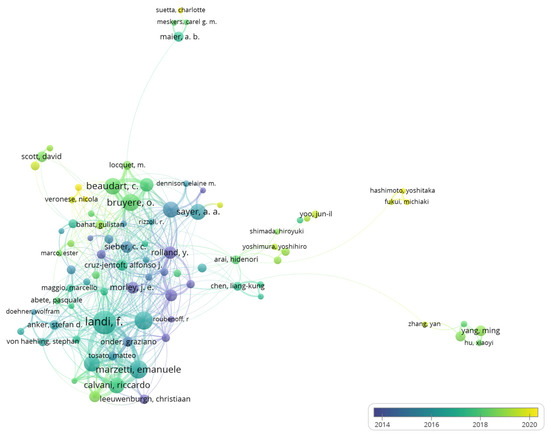 A total of 17,587 authors were identified. Table S4 lists the most influential authors with high publications and citations. Productive authors are from organizations with high publications, 4 of the top 10 most published authors are from the Catholic University of the Sacred Heart. We identified 98 authors who published at least 10 papers. After removing 13 nodes that were not linked to others, the coauthorship analysis is shown in Figure 4. Landi F had the most documents, citations, and the highest TLS. Authors with earlier AAY started earlier in sarcopenia research and are labeled with purple colors, and authors labeled by yellow color may be the emerging influential investigators.