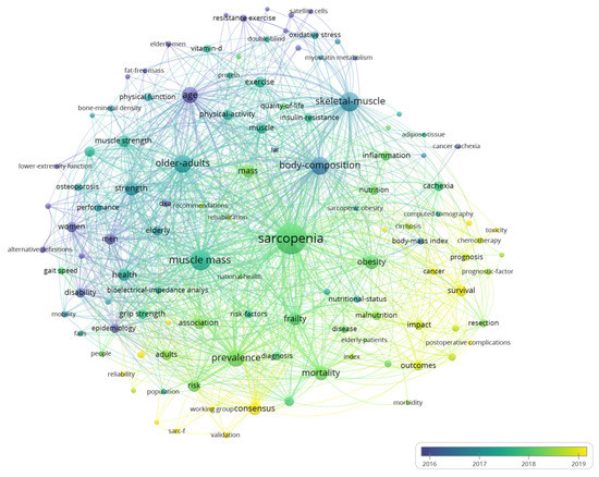 VOSviewer was used to conduct the coauthorship analysis and keywords co-occurrence analysis, and the normalization method was LinLog/Modularity. Coauthorship analysis of countries, organizations, and authors was used to help uncover the core contributors to the sarcopenia field. Since authors will carefully select the keywords of their papers, and Keywords Plus were generated from the titles of an article’s references [26], we conducted a co-occurrence analysis of both keywords to reveal the hot spots in sarcopenia research. In networks, nodes represent different elements including countries, organizations, authors, and keywords. The total link strength (TLS) is a good indicator of the cooperative or co-occurrence strength. The color indicates the average appearing year (AAY).
