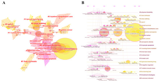 The prevalence of sarcopenia varies by diagnostic criteria, ethnicity, and population. In addition to the aforementioned epidemiology of sarcopenia in the general population, sarcopenia in patients with chronic diseases or cancer is also a research hotspot. As shown in Figure 7A, “#1 liver cirrhosis”, “#6 preoperative sarcopenia” and “#8 gastric cancer” were identified as subfields of sarcopenia. Sarcopenia is very common in patients with chronic liver disease, occurs in 30–70% of patients with liver cirrhosis [65], and is thought to be associated with quality of life, hepatic encephalopathy, post-liver transplant outcomes, and even mortality [66,67]. Other chronic diseases, such as chronic obstructive pulmonary disease (COPD) [8,68], chronic kidney disease (CKD) [69,70], and diabetes [71,72] are also independently associated with sarcopenia. Sarcopenia is also of increasing interest in oncology research because of its high prevalence and adverse outcomes. Due to the various definitions used, the prevalence of sarcopenia in patients with different tumors varies from 5–89% [73]. In a recent umbrella review, sarcopenia was found to be associated with poor prognosis in gastric cancer, hepatocellular cancer, urothelial cancer, head and neck cancer, hematological malignancy, pancreatic cancer, breast cancer, colorectal cancer, lung cancer, esophageal cancer, and ovarian cancer, while significantly increasing the risk of postoperative complications and prolonged hospitalization in patients with digestive cancer [74]. In addition, sarcopenia is related to reduced patient response to chemotherapy drugs and increased toxicity, which in turn can lead to further exacerbation of sarcopenia [75].