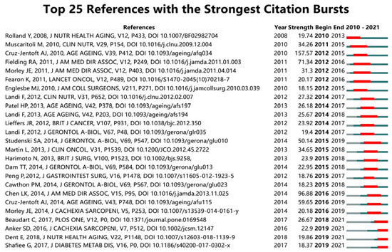 Burst-detection analysis captures papers with a sharp increase in citations over a specific period, and it helps to find important milestone papers in the development of a research field. References with the strongest citation bursts in the sarcopenia field between 2010 to 2021 were identified (Figure 8). The first of these references was written by Rolland Y et al. [29], who in 2008 reviewed the assessment, etiology, pathogenesis, and consequences of sarcopenia, which provided the basis for subsequent consensus. In addition to the studies we mentioned earlier, Martin L et al. [30] analyzed muscle loss in patients with solid tumors using CT images and found that regardless of whether patients presented obese or not, low muscle index and low muscle attenuation were independently a poor prognostic of survival. While the citation burst for most references has ended, some articles continue to be cited frequently, suggesting that they are still considered reliable sources in recent times. Of these, Shafiee G et al. [31] conducted a meta-analysis and estimated the global prevalence of sarcopenia in healthy adults aged over 60 years of age. The studies they analyzed were conducted between 2009 to 2016 and showed that 10% of men and 10% of women, respectively, were affected by sarcopenia. Beaudart C et al. [32] evaluated the short-, middle- and long-term health outcomes of sarcopenia in a meta-analysis and found that sarcopenia was associated with higher mortality, functional decline, falls, and hospitalization rates.