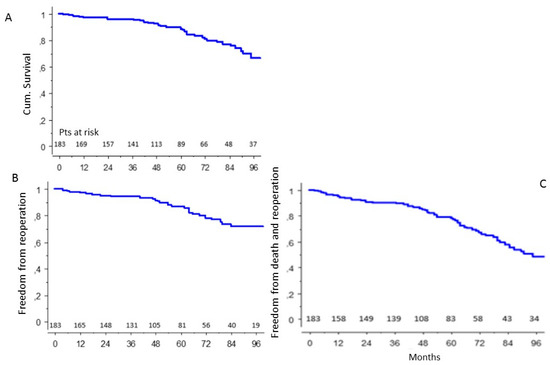 Cumulative survival (A), freedom from reoperation (B), freedom from composite end-point (death + reoperation) (C) in the general population of patients.