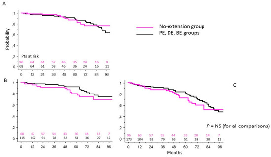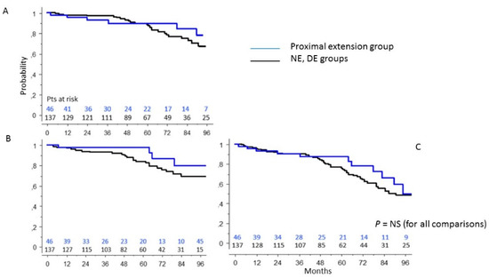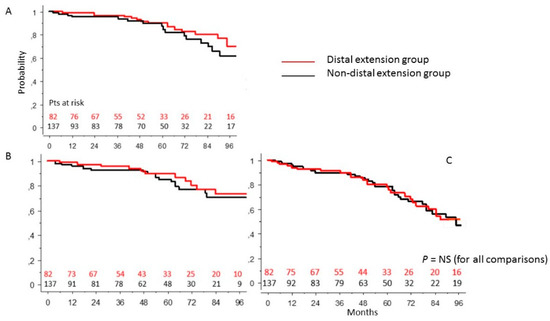 Survival (A), freedom from reoperation (B), freedom from composite end-point (death + reoperation) (C) in the DE group of patients in comparison with those in the non-distal extension group of patients (log-rank test).