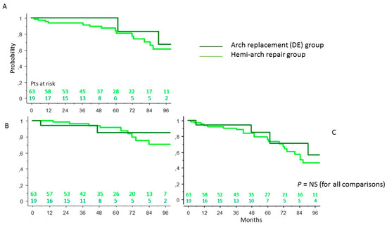 Survival (A), freedom from reoperation (B), freedom from composite end-point (death + reoperation) (C) in patients undergoing total aortic arch replacement vs. patients undergoing hemi-arch repair (log-rank test).