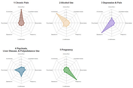 Radar plots for five subphenotypes of ED patients with opioid-related encounters.