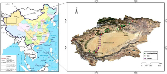 Southern Xinjiang has a typical arid climate in northwest China, with an average annual precipitation rate of 150 mm. Most of the crops are covered with film during growth, and particularly almost all cotton plants are film-mulched [14]. It has been reported that residual mulch is the main source of MPs on land [15]. Korla, Alar and Hetian are important cities in southern Xinjiang with relatively concentrated populations and relatively developed economies. Due to the long-term human activities and irrational disposal of plastic products, there may be serious MP pollution in the surrounding environment. The desert highway from Alar City to Hotan City is 424 km long, greatly promoting the economic and social prosperity of southern Xinjiang. Because of the fluidity of the Taklimakan Desert, highway builders and researchers have built mechanical protection systems on both sides of the road, using grass grids and plastic sand barriers. Due to the meteorological characteristics of extreme drought, high temperature and strong ultraviolet radiation in the desert, the continuous damage from the plastic sand barrier might have caused microplastic pollution in the surrounding environments.