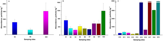 MP abundance levels in different sampling sites: (A) city; (B) farmland; (C) Taklimakan Desert.