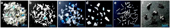 Different shapes of partial microplastic samples collected from the urban streets, farmland soils and desert areas along the highway in southern Xinjiang, China: (a) mixed MPs; (b) flakes; (c) films; (d) fragments; (e) fibers; (f) rubbers.