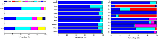 Compositions of different MP shape categories in cities (A), farmlands (B) and deserts along the highway (C) in southern Xinjiang, China.