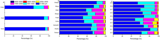 Figure 5 shows the size distribution patterns of MPs in cities (Figure 5A), farmlands (Figure 5B) and deserts along the highway (Figure 5C) in southern Xinjiang, China. As shown in Figure 5, in general, the contents of the different particle sizes showed a decreasing trend after the increase in particle size. The MPs with particle sizes < 500 μm were dominant in all sampling sites, with the rates varying from 48.0% to 91.5%. The particle sizes of 500–1000 μm and 1000–2000 μm appeared in all sampling sites, with the percentages varying from 5.21 to 37.74 μm and from 1.45 to 24.29 μm, respectively. The particle sizes of 2000–3000 μm were present in all sampling sites except the Areal street dust sample, with a lower percentage range of 0.46–10.08 μm. The particle sizes of 3000–5000 μm were only present in several sampling sites with very low numbers (<5%). In different types of sampling sites, the mean percentage of particles <500 μm for MPs in cities was 81.90%, which was significantly higher (p < 0.05) than the mean percentages in farmlands (65.27%) and desert sampling sites (63.23%). Comparatively, the mean percentages of particles measuring 500–1000 μm and 1000–2000 μm in cities were 12.67% and 4.44%, respectively, which were significantly lower than the mean percentages in farmlands (13.94% and 16.96%, respectively) and desert sampling sites (20.43% and 10.78%, respectively). Additionally, our survey found that the minimum microplastic size was 51.8 ± 2.2 μm in urban street dust samples, 54.2 ± 5.3 μm in farmland soil samples and 67.8 ± 8.4 μm in samples along the desert highway.