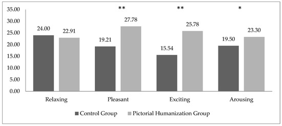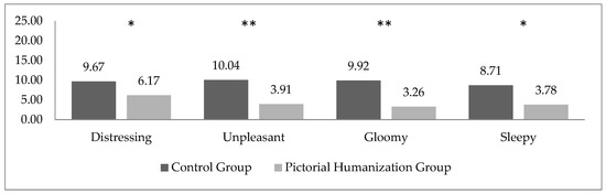 Taken together, these results seemed to suggest that the intervention of pictorial humanization is associated with the affective perception of environment but not with parental distress. If this result support the importance of creating more suitable environments for patients and their families [49,87], it should also be considered in addition to approaches focused on patient affective states, especially in contexts where hospitalization is an extremely stressful experience.